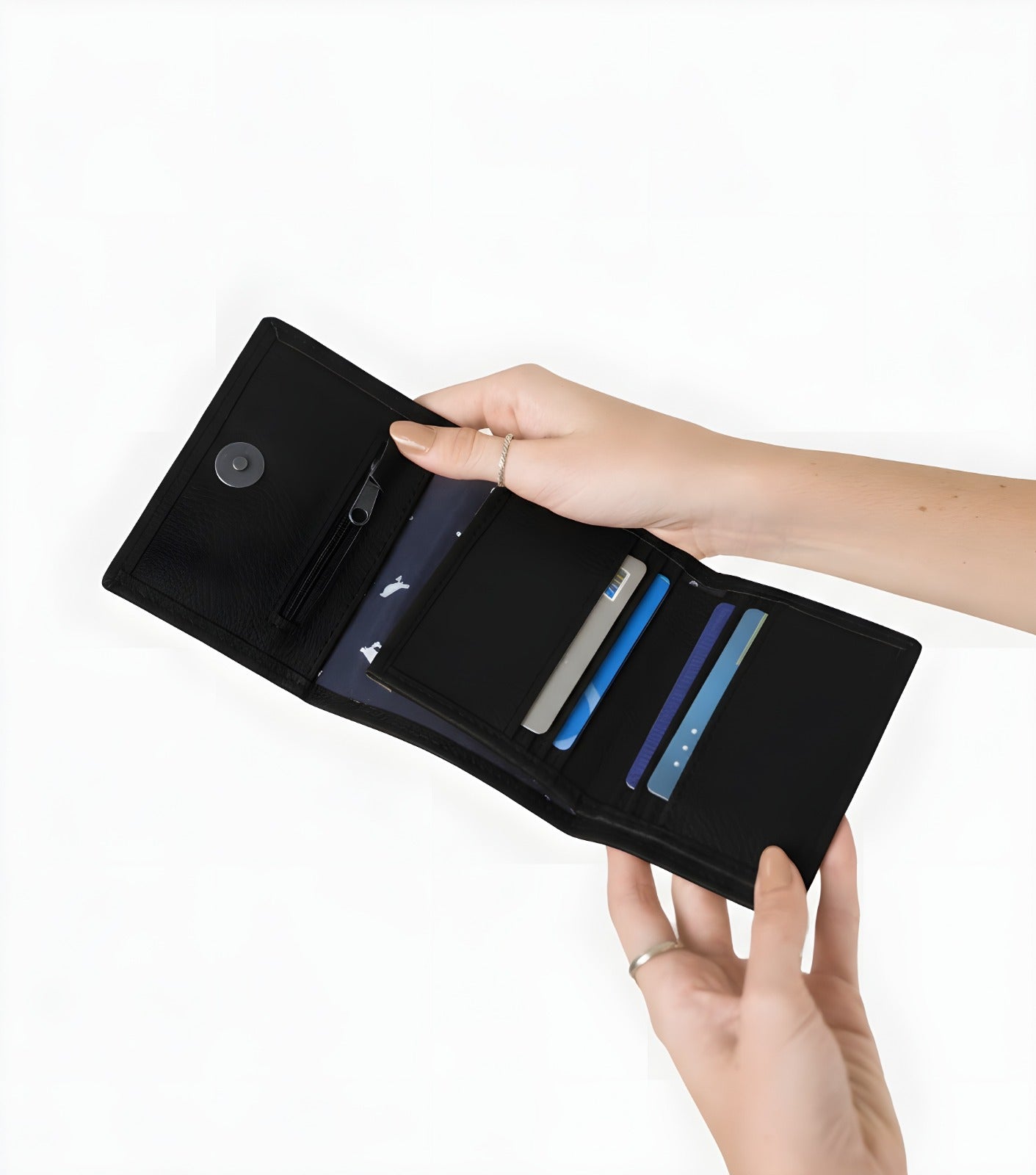 Billetera tríptica corta de cuero sintético. Cierre con imán. Interior forrado con pajaritos. Monedero con cierre. Este y todos nuestros productos son hechos a mano. Proveemos trabajo sostenido procurando un precio digno a más de 12 familias locales. Producto 100% vegano, sin sufrimiento animal #crueltyfree